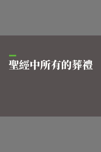 此數據集提供了舊約、次經和新約中各個葬禮的註釋。葬禮的形式因文化而異,也受當地地形影響。 死者的遺體可以被埋葬在洞穴、墓穴或墳墓中,但很多時候文中並沒有明確說明埋葬的方式。 此數據集也包含了這些很有幫助的資訊:埋葬的地點、墓地的主人、墓地的標記,與死亡和埋葬有關的儀式禮儀。本書是Logos 獨家資源《聖經中的事物》全集中的一冊。